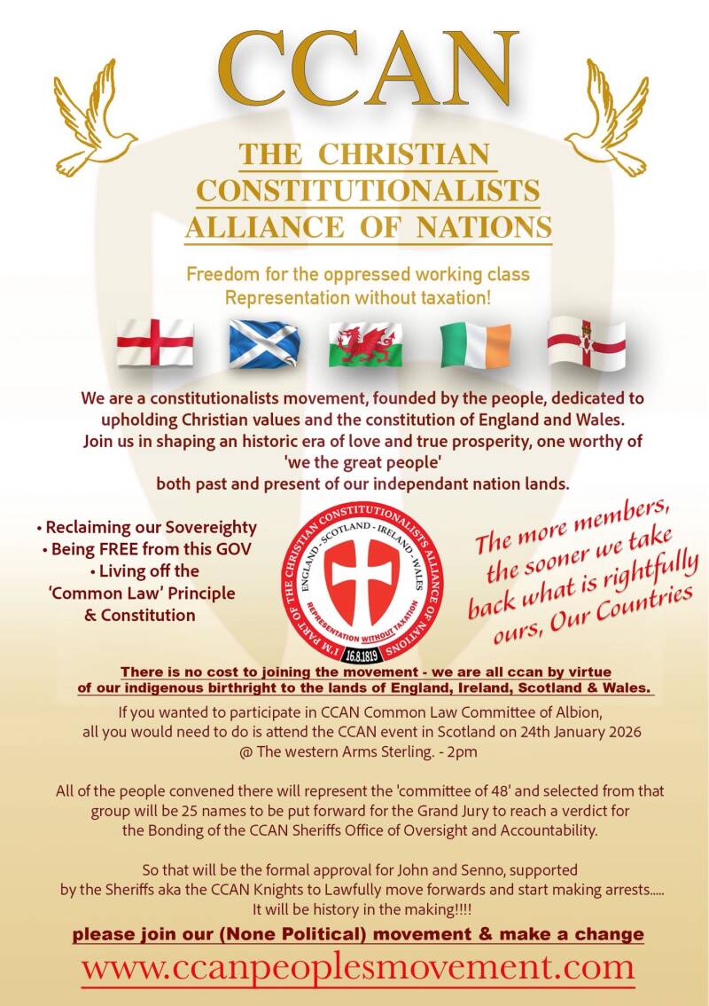 The ccan Knights are formed under the posse comitatus act for the purpose of assisting the common law sheriffs in their duties as a supra national enforcement arm for all nations, offering oversight and accountability of any corporate body operating in England Ireland Scotland and Wales.